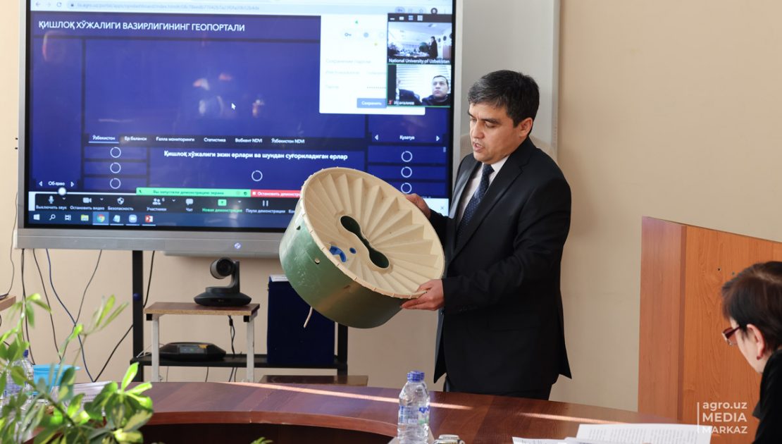 “Biz tomondan modifikatsiyalashtirilib, ishlab chiqilgan “Suv yig‘ish qurilmasi” foydali modeli sodda, tejamkor va universal moslama hisoblanadi, – deydi Qishloq xo‘jaligi vaziri o‘rinbosari Maqsud Ro‘zmetov. – U 2 ta yarim silindirdan iborat bo‘lib, har bir silindr 15 litr hajmga ega, ular yon tomonidan birlashtiriladi va 30 litr hajmga ega yaxlit konteyner shakllanadi. Ustki yon qismiga o‘rnatilgan halqa hisobiga qurilma yuza sathi diametri 70 smga yetadi, bu esa yog‘in suvini konteynerga to‘liq yig‘ish imkonini beradi, suv sarfi vegetatsiyaning 104-110 kuniga (to‘liq) yetadi”.