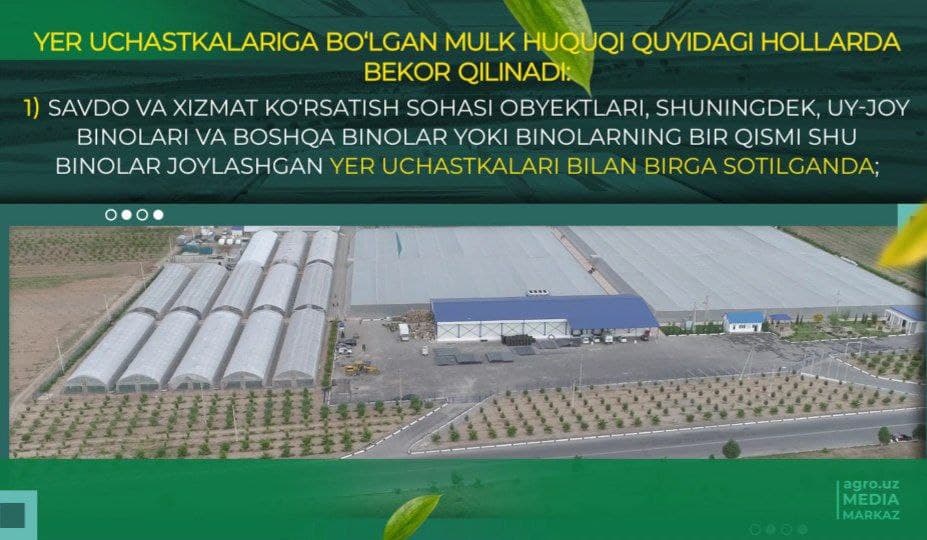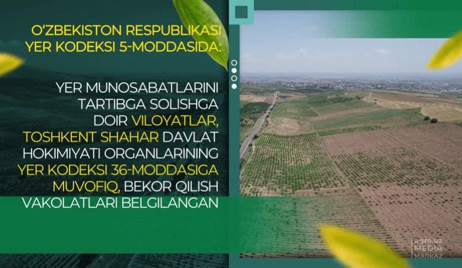 Bugungi kunda O‘zR Qishloq xo‘jaligi vazirligi veb-sayti hamda ijtimoiy tarmoqlardagi sahifalariga aholiga yer maydonlarini ajratish, yer uchastkasini ijaraga olish huquqlarini bekor qilish tartibi hamda yer munosabatlariga doir boshqa masalalar bo‘yicha ko‘plab savol va murojaatlar kelib tushmoqda. Shuni inobatga olib, vazirlikning Media-axborot tahlil bo‘limi tomonidan maʼlumot beruvchi maxsus videolavha tayyorlandi.