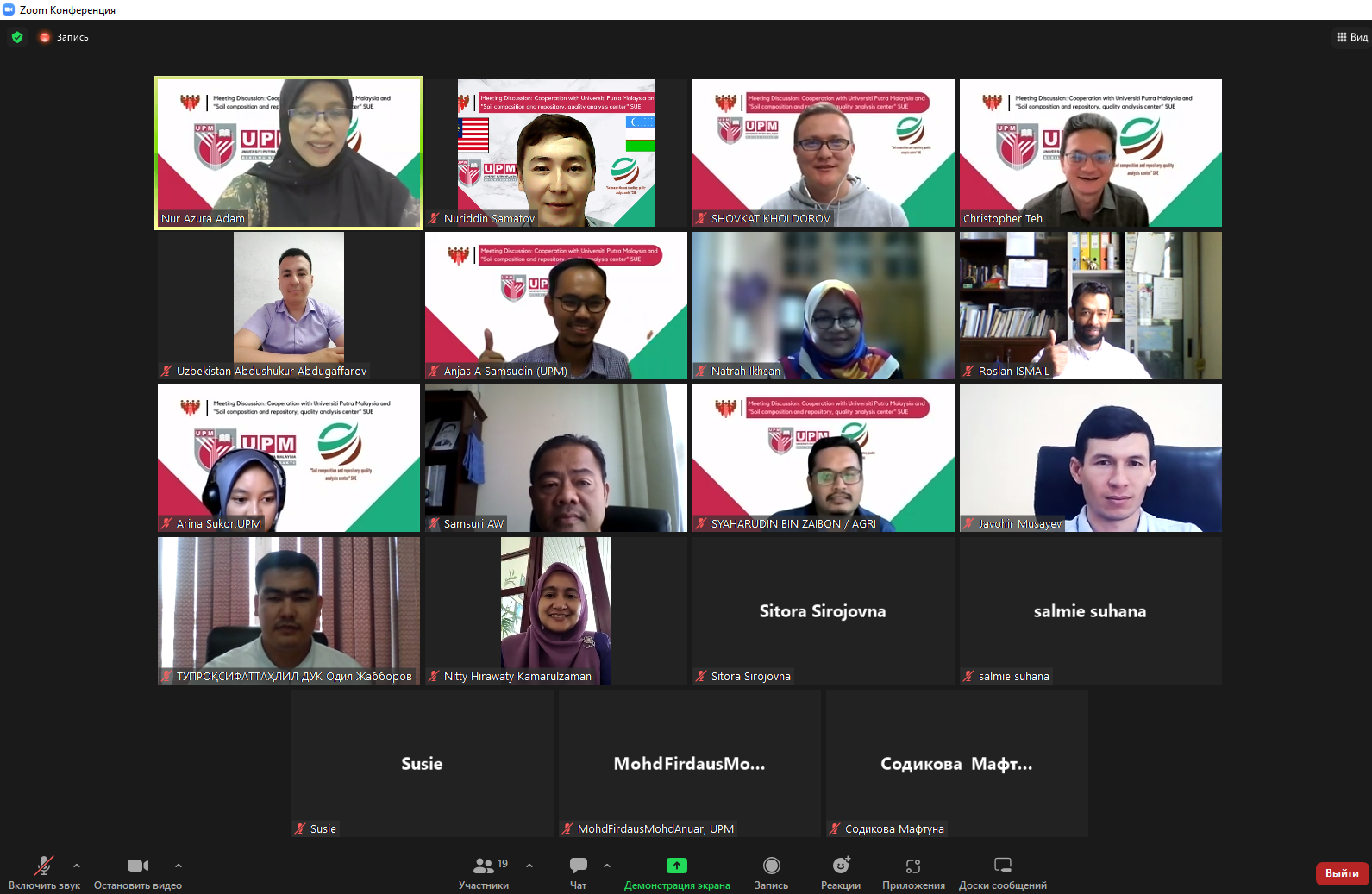 Представители ГУП «Tuproqsifattahlil» (ГУП «Аналитический центр состава и репозиторий, качества почв») при Минсельхозе РУ провели онлайн-встречу с сотрудниками кафедры сельского хозяйства малазийского университета Universiti Putra Malaysia.