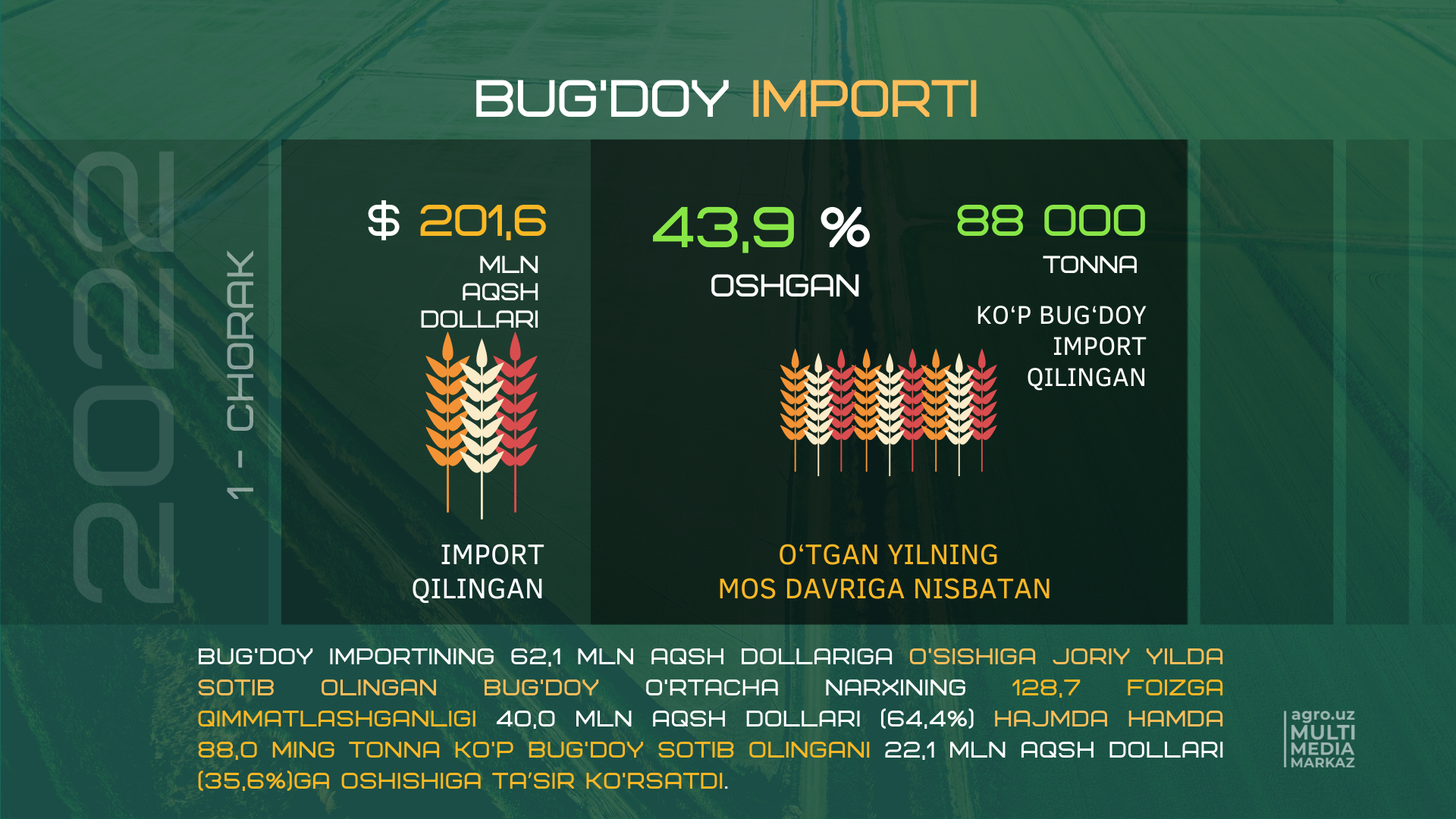 Davlat Statistika qo‘mitasi maʼlumotiga ko‘ra, O‘zbekistonda 2022-yil 1-choragida 201,6 mln dollarlik bug‘doy import qilingan bo‘lib, o‘tgan yilning mos davriga nisbatan 62,1 mln dollar (43,9%)ga oshgan. Shu bilan birga, mazkur davrda 803,6 ming tonna, o‘tgan yilga nisbatan 88 ming tonnaga ko‘p bug‘doy import qilingan. O‘rtacha sotib olingan bug‘doy narxi o‘tgan yilning mos davriga nisbatan 128,7 foizga qimmat bo‘lgan.