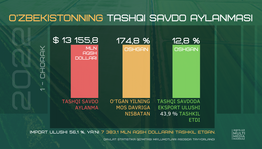 2022-yil 1-choragida O‘zbekistonning tashqi savdo aylanmasi 13 155,8 mln dollarni tashkil etib, o‘tgan yilning mos davriga nisbatan 174,8 foizga oshgan. Tashqi savdoda eksport ulushi ijobiy o‘zgarib, o‘tgan yilning 1-choragiga nisbatan 12,8 foizga oshib, 43,9 foizni tashkil etdi. Umumiy eksport hajmi 5 772,2 mln dollar (238,7%)dan iborat bo‘lgan.