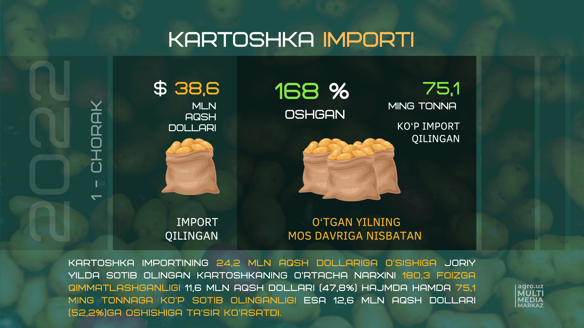 Kartoshkaning import hajmi 38,6 mln dollarni tashkil etib, o‘tgan yilning mos davriga nisbatan 24,2 mln dollar (168%) ga oshgan.