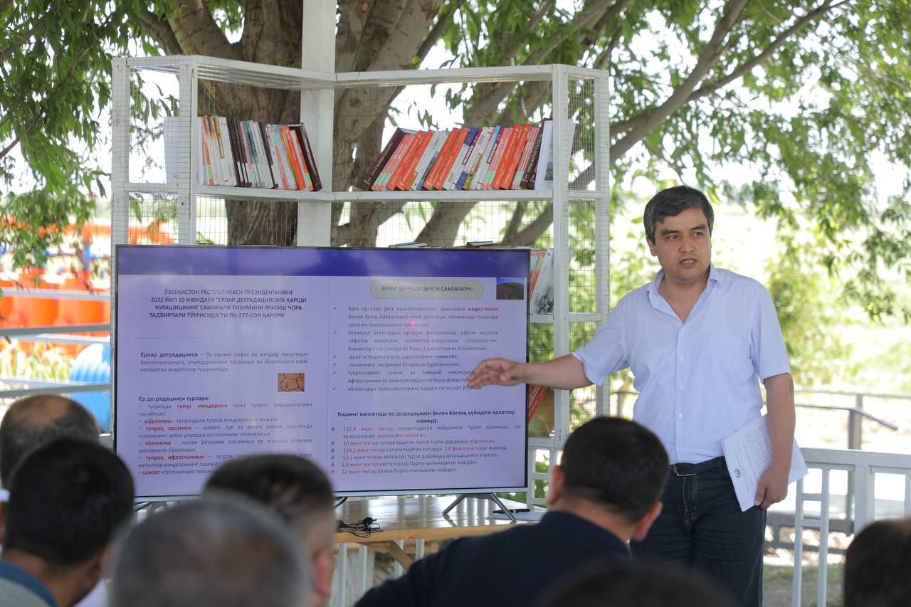 Shuningdek, yerlar degradatsiyasiga qarshi kurashish ishlarini tizimli tashkil etish, cho‘llanishning oldini olish, qishloq xo‘jaligi ekinlarini almashlab ekish kabi mavzularda maʼruzalar tinglandi.