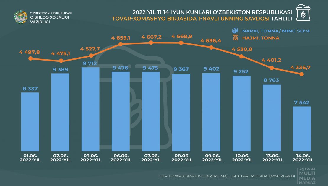 So‘nggi kunlarda Tovar-xomashyo birjalarida un narxining pasayishi kuzatilmoqda. Jumladan, joriy yil 1-yun kungi birja savdolarida bir tonna 1-navli un mahsuloti 4 497,8 ming so‘mdan sotilgan bo‘lsa, 14-iyun kungi birja savdolarida 1-navli unning narxi 4 336,7 ming so‘mni tashkil etdi va boshlang‘ich narxga nisbatan 3,6 %ga arzonlashdi. Ayniqsa, 8-iyun kunidan boshlab un narxida keskin pasayishlarni ko‘rishimiz mumkin. Shuningdek, 8-14-iyun kungi savdolarda un narxining kunlik pasayishi 0,6-2.9 % ni tashkil etdi.