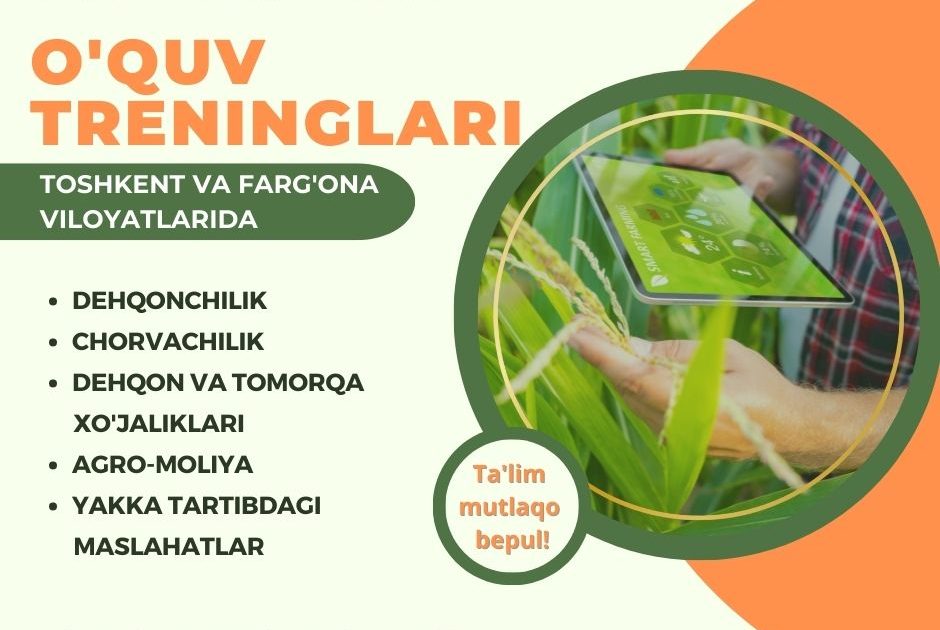Oʻzbekiston Respublikasi Qishloq xoʻjaligi vazirligi hamda YEI ASK dasturi Toshkent va Fargʻona viloyatlaridagi qishloq xo‘jaligi mahsulotlarini yetishtiruvchilar (fermerlar, dehqonlar, chorvadorlar, agro-tadbirkorlar)ni agromaslahat treninglarida ishtirok etishga taklif qiladi.