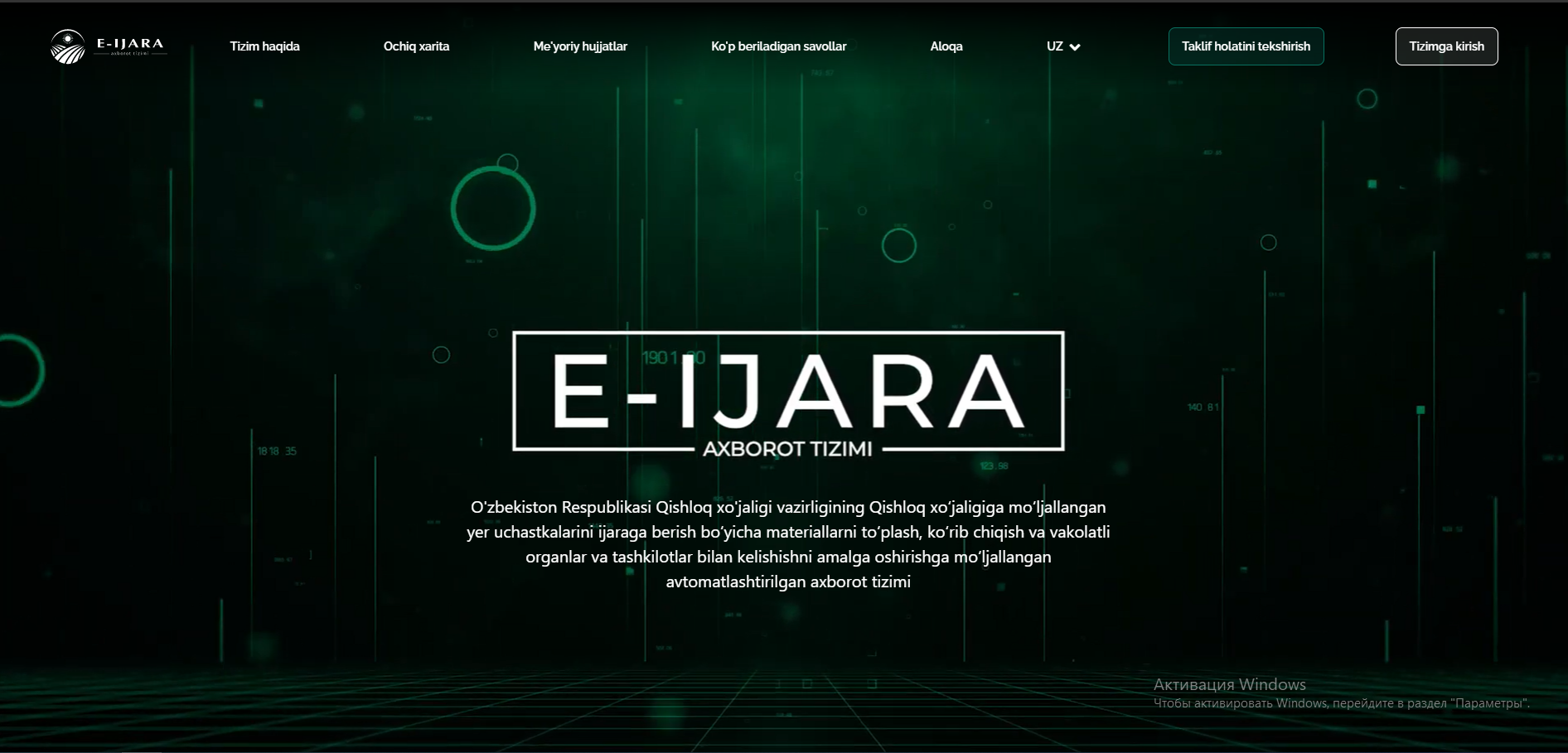 Maʼlumot uchun: O‘zbekiston Respublikasi Qishloq xo‘jaligi vazirligining qishloq xo‘jaligiga mo‘ljallangan yer uchastkalarini ijaraga berish bo‘yicha materiallarni to‘plash, ko‘rib chiqish va vakolatli organlar hamda tashkilotlar bilan kelishishni amalga oshirishga mo‘ljallangan “E-IJARA” avtomatlashtirilgan axborot tizimi 2021-yil 23-dekabrdan ishga tushirilgan. Mazkur tizim ochiq elektron tanlovlarni o‘tkazish maqsadida lotlarni “E-AUKSION” elektron savdo platformasiga chiqarish, shuningdek g‘oliblarning huquq va hujjatlarini tegishli idoralarda rasmiylashlashtirishga ko‘maklashish uchun foydalanilmoqda.