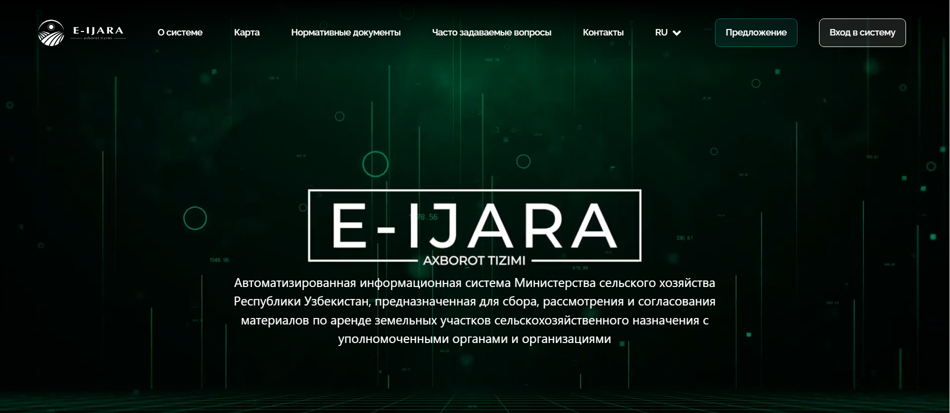Новая «frontend» часть и дизайн информационной системы «E-IJARA» по аренде посредством открытых электронных конкурсов – порядка 200 тыс. га освобожденных в 2022-2025 годах от хлопка и зерна сельхозземель вблизи населенных пунктов, с хорошим водоснабжением – разработана для максимального удобства пользователей.