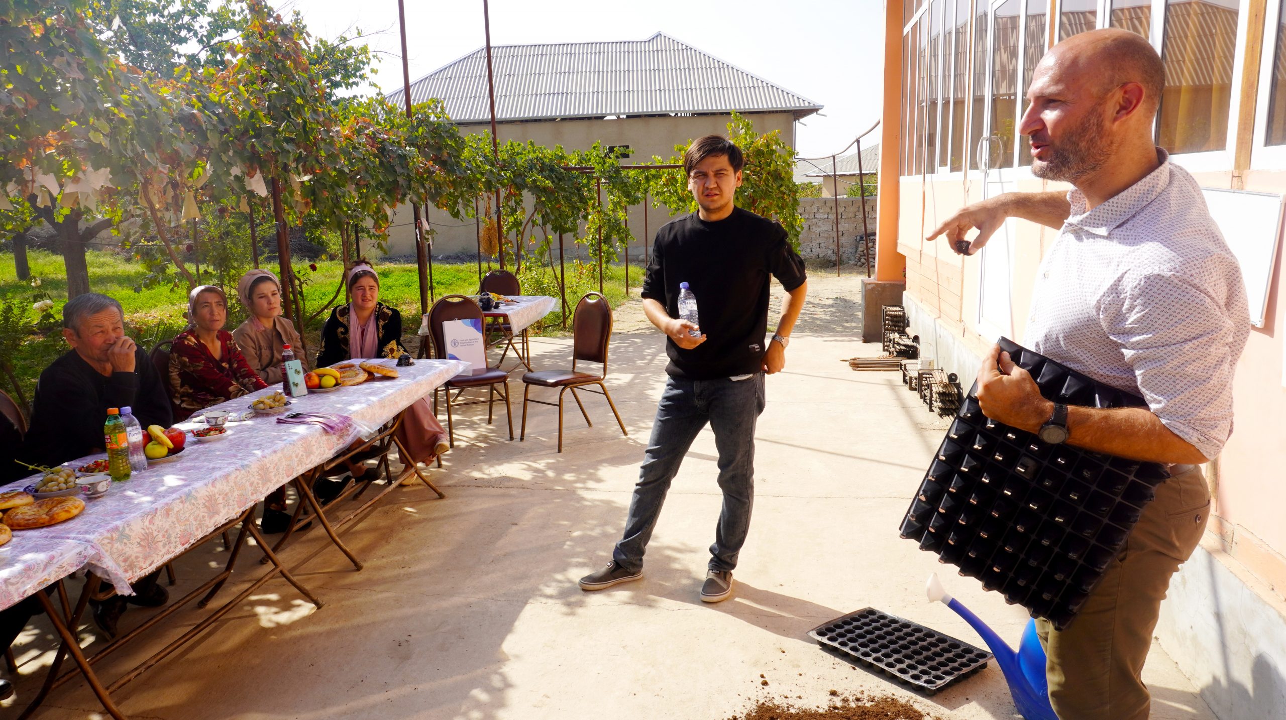 Следующее направление для улучшений – это выращивание и производство качественной рассады овощей в лотках. По этой теме зарубежный специалист провел тренинги для бенефициаров и других заинтересованных лиц во всех трёх целевых районах. Общее количество участников составило 55 человек. Ведь производство рассады – самый интенсивный из всех видов овощного бизнеса. К тому же посев семян овощей в лотках является популярной практикой среди фермеров во всем мире, поскольку это позволяет получать качественную рассаду и более высокий урожай. Леоне отметил, что фермерам выгоднее выращивать рассаду самостоятельно, причем не только для себя, но и в коммерческих целях. По итогам из числа бенефициаров проекта были выбраны 3 наиболее перспективных фермера, заинтересованные в выращивании саженцев, которые получат от проекта ФАО дополнительную поддержку для налаживания производства рассады.