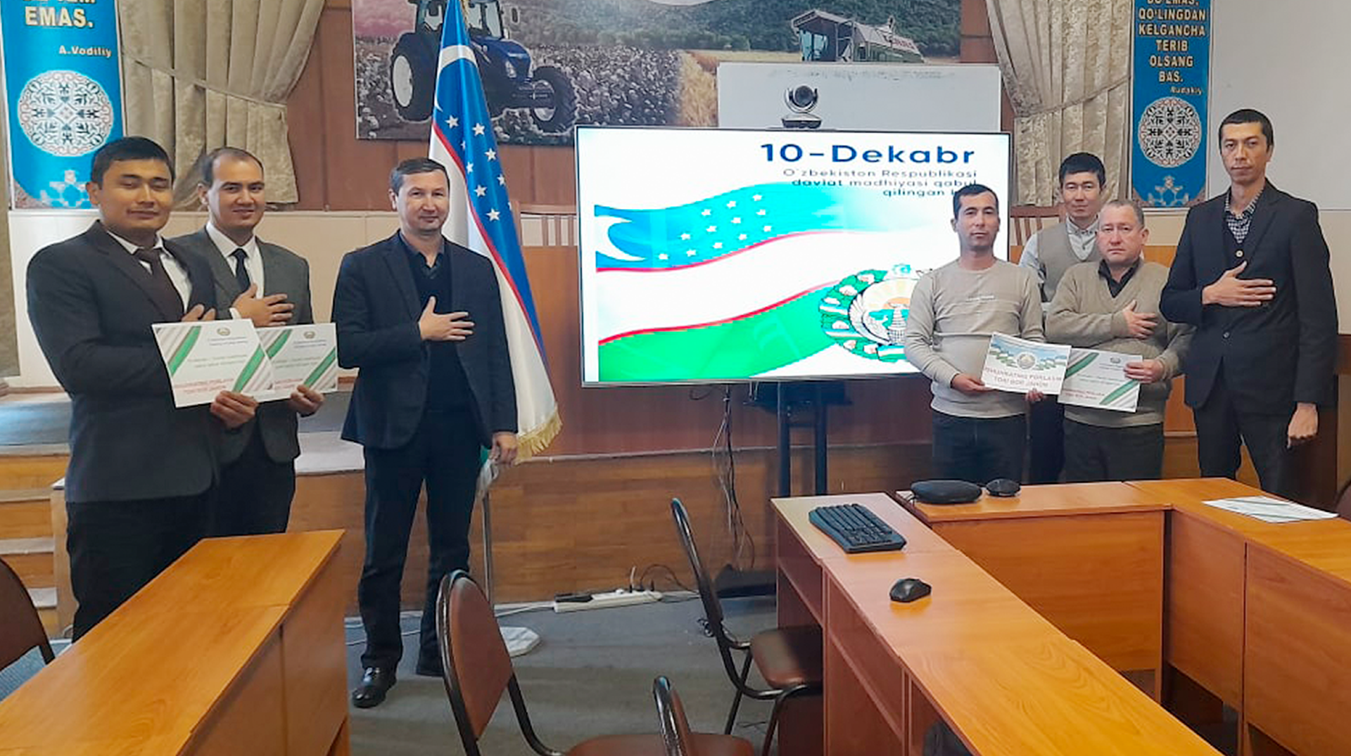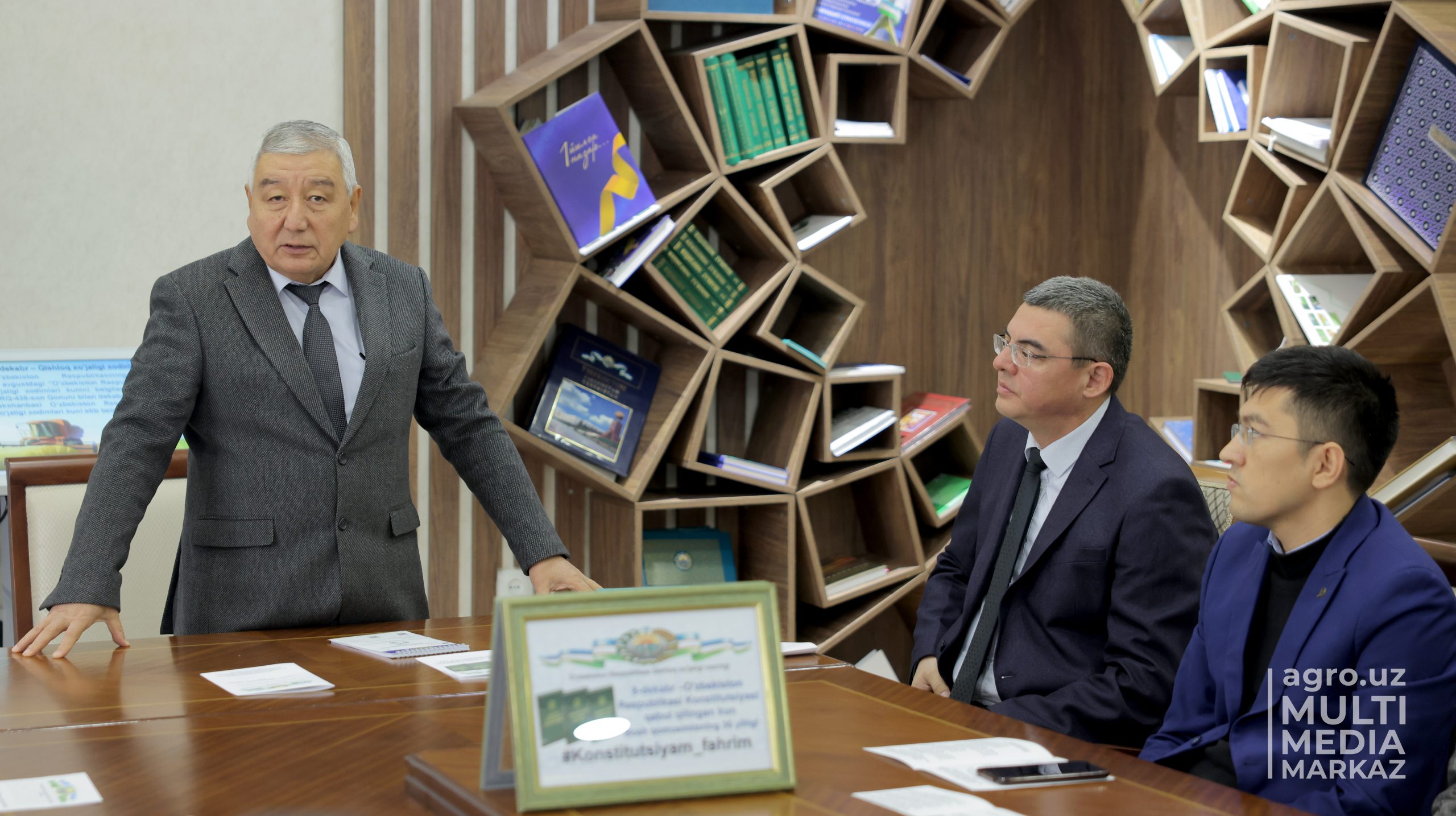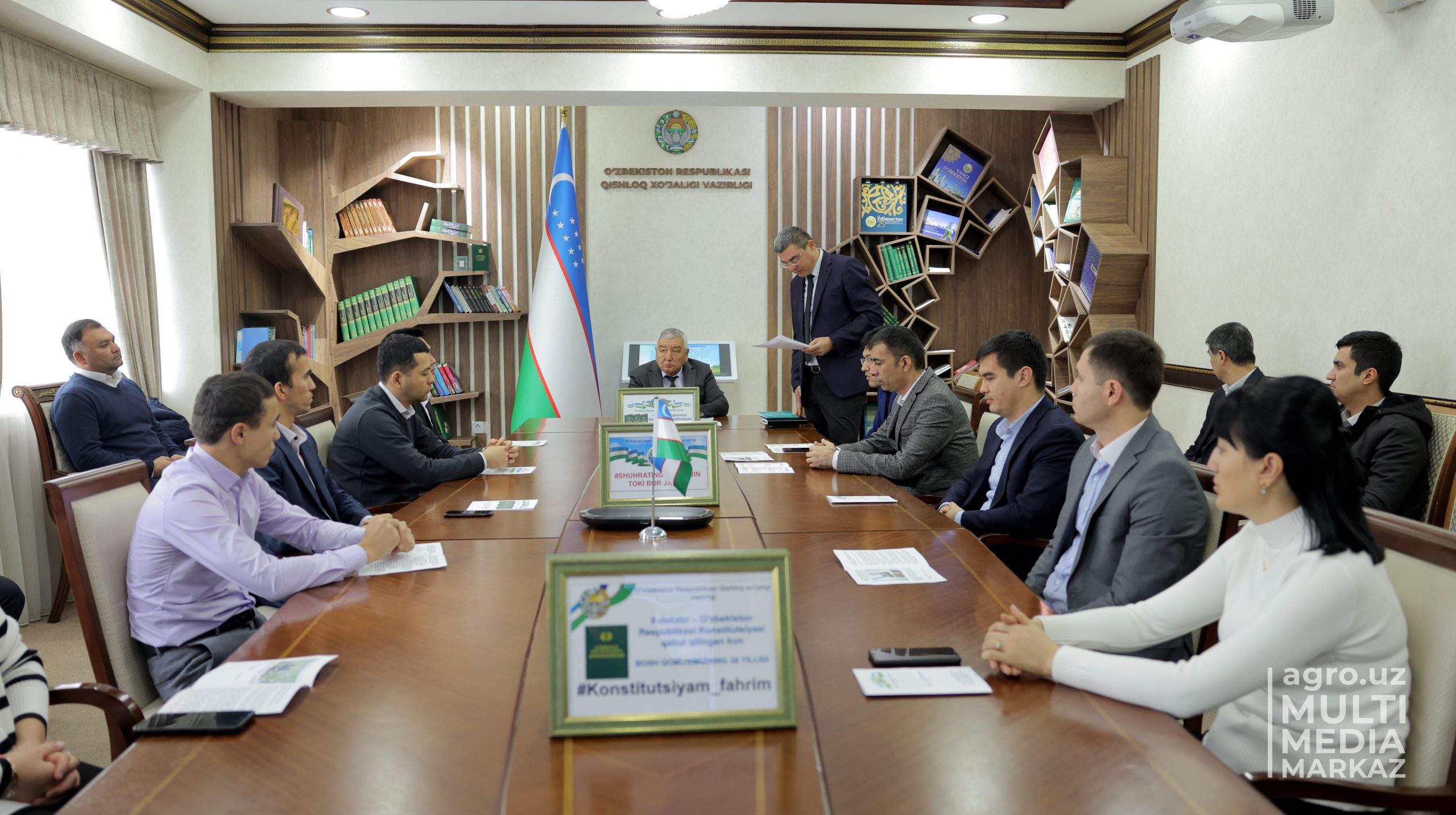 O‘zbekiston Respublikasi Konstitutsiyasi hamda Davlat madhiyasi qabul qilinganligining 30 yilligi munosabati bilan Qishloq xo‘jaligi vazirligi markaziy apparati tarkibiy bo‘linmalari rahbarlari va mas’ul xodimlari ishtirokida ma’naviy-ma’rifiy tadbir bo‘lib o‘tdi.