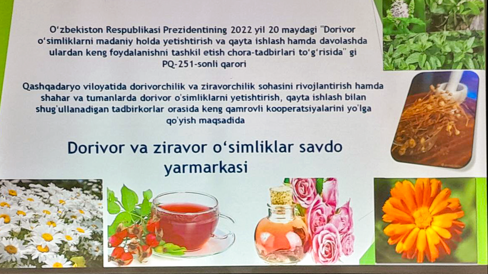 2023-yilning 28-mart kuni Qashqadaryo viloyatida dorivor o‘simliklarni yetishtirish, qayta ishlash bilan shug‘ullanadigan tadbirkorlar orasida keng qamrovli kooperatsiyani yo‘lga qo‘yish, dorivorchilik va ziravorchilik sohasini rivojlantirish bo‘yicha ixtisoslashgan savdo yarmarkasi o‘tkazildi.