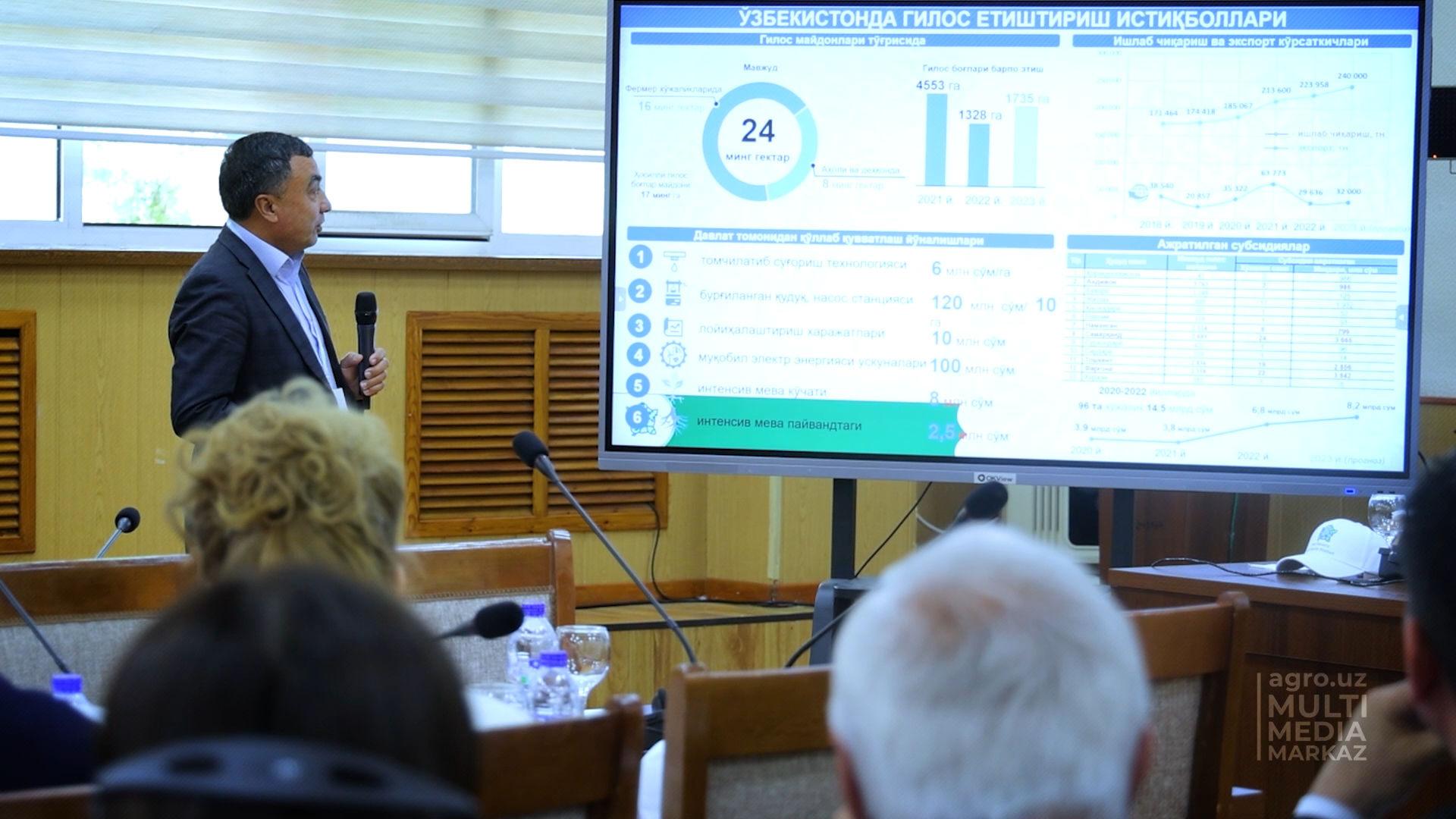 — O‘zbekistonda aprel oyidan gilos mavsumi boshlanadi. Besh-olti oy davomida gilosni mahalliy va xorijiy bozorlarga yetkazish ishlari amalga oshiriladi. Bugungi seminar mamlakatimizdagi gilos bog‘larida qilinayotgan ishlar bilan tanishtirish, mahsulotimizni butun dunyoga yanada kengroq namoyish etish maqsadida tashkil etildi. Yurtimizda giloszorlar soni yildan yilga oshib bormoqda. Oxirgi uch yil davomida barcha toifa xo‘jaliklarida 10 ming gektardan ortiqroq gilos bog‘lari tashkil etildi. Bugungi kelib esa, 25 mingga yaqin bog‘larimiz mavjud. Anjumanda ham taʼkidlanganidek, oldin asosan baland o‘suvchi gilos bog‘lari mavjud edi. Hozirda esa intensiv texnologiyalar asosida pakana va yarim pakana gilos bog‘larini rivojlantirish, ularni tashkil etish yo‘lga qo‘yildi. Asosiy hosil aynan ushbu bog‘laridan olinmoqda.