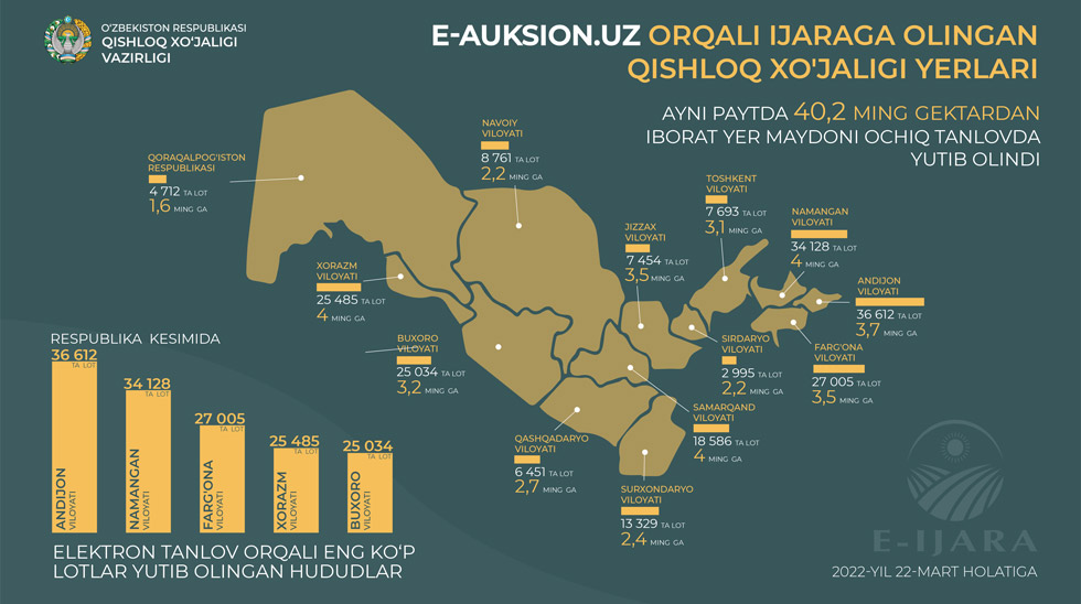 Qishloq xo‘jaligi yerlarini “E-AUKSION.UZ” elektron savdo maydonchasi orqali ijaraga berish 2022-yilning yanvar oyidan boshlab yo‘lga qo‘yildi. Yangi shaffof tizim faol rivojlanmoqda: 2022-yil 22-mart holatiga ko‘ra, qishloq xo‘jaligi yerlari elektron tanlovga chiqarilgan 320 746 ta lotdan 218 245 ta lot (umumiy maydoni – 40 278,7 gektar) bo‘yicha g‘oliblar (jismoniy va yuridik shaxslar) aniqlangan.