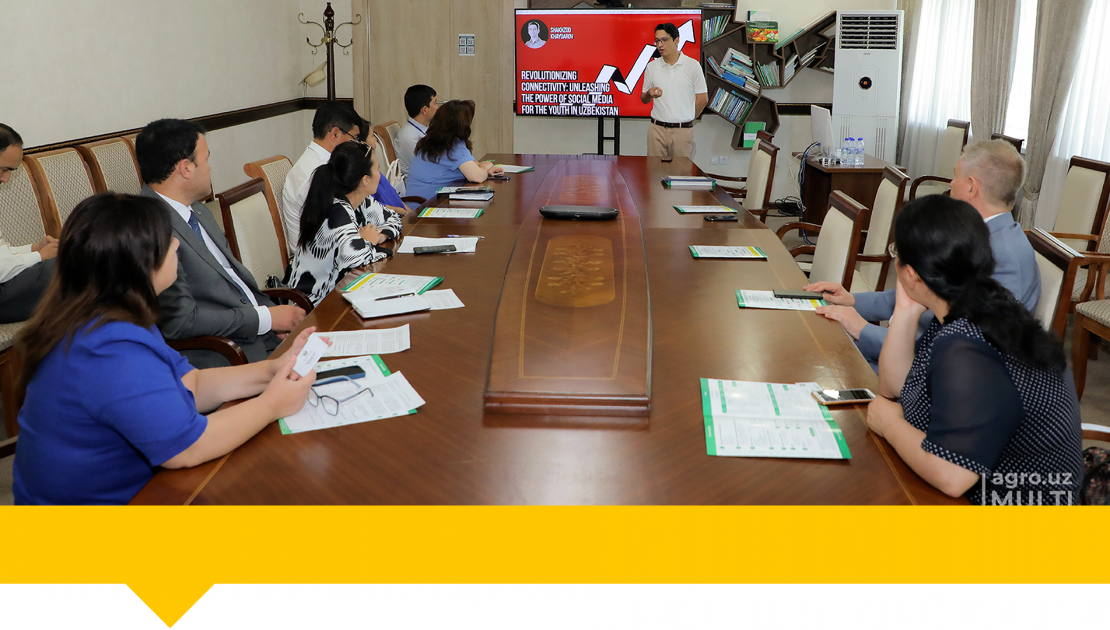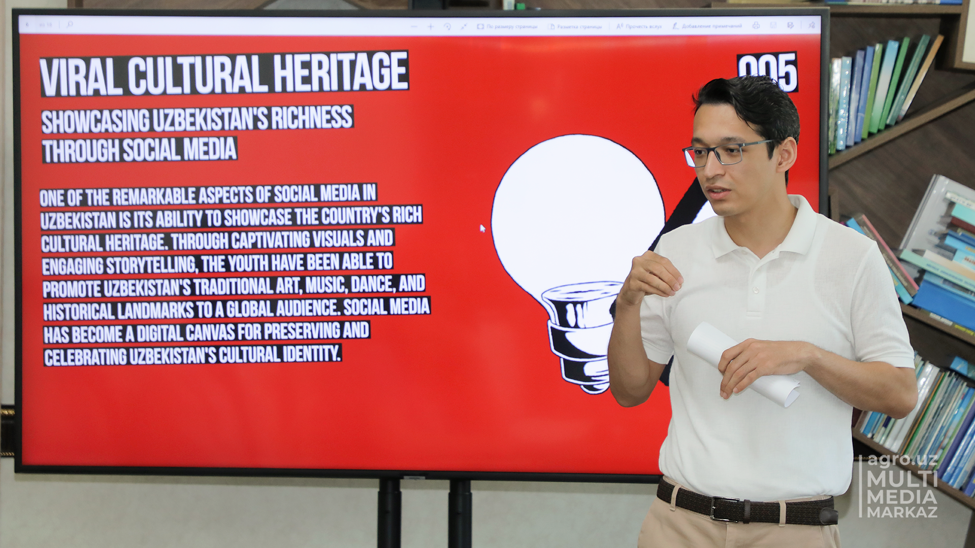 Xalqaro qishloq xo‘jaligi universiteti Marketing bo‘limi boshlig‘i Shahzod Haydarov o‘tkazgan taqdimot mavzusi ham dolzarbligi bilan ajralib turdi: ijtimoiy tarmoqlar, yoshlar va qishloq xo‘jaligida karyera. Taqdimot doirasida bugungi yoshlar hayotida ijtimoiy tarmoqlarning o‘rni, ular orqali yoshlarda qishloq xo‘jaligida ishlashga qiziqish uyg‘otish, qishloq xo‘jaligi xodimining obro‘sini yuksaltirish masalalari atroflicha o‘rganildi.