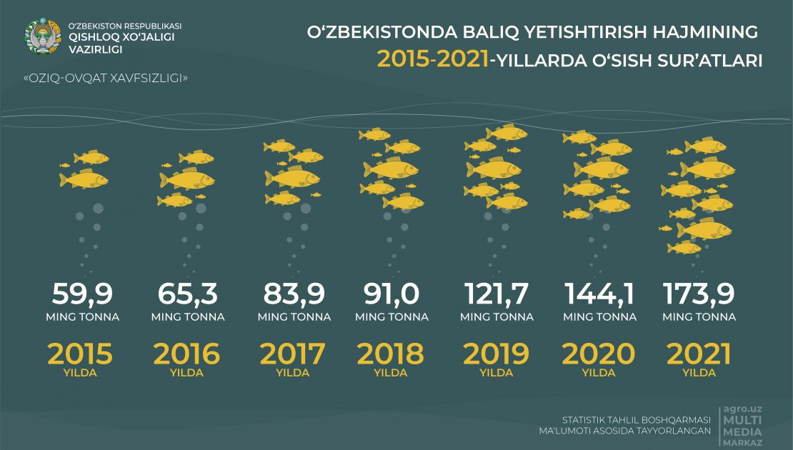 Ushbu chora-tadbirlarning barchasi o‘zining sezilarli samarasini bermoqda. Oxirgi besh yil ichida mamlakatimizda baliq yetishtirish hajmi uch baravar oshdi: agar 2015-yilda 59,9 ming tonnani tashkil etgan bo‘lsa, 2021-yilda bu ko‘rsatkich 173,9 ming tonnaga yetdi.