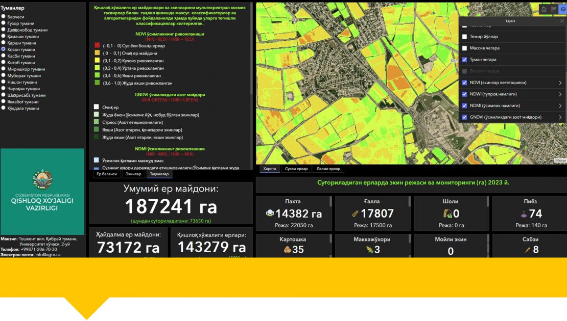 Zamonaviy geografik axborot tizimlari va masofadan zondlash texnologiyalari soha yo‘nalishlari bo‘yicha yagona fazoviy maʼlumotlar bazasini shakllantirish, tizimlashtirish, saqlash, tahlil va tezkor qarorlar qabul qilishning imkoniyatlarini kengaytirmoqda va bu borada Qishloq xo‘jaligi vazirligining integratsiyalashgan Geoaxborot tizimi ishlab chiqilgan.
