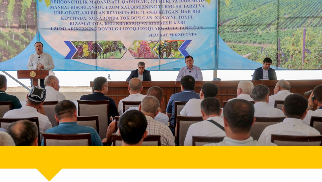 Tadbirda O‘zbekiston Respublikasi Prezidentining maslahatchisi Shuhrat G‘aniev, Qishloq xo‘jaligi vaziri Aziz Voitov, Suv xo‘jaligi vaziri Shavkat Hamroev, hududlar qishloq xo‘jaligi boshqarmalari boshliqlari, butun respublikadan uzumchilikka ixtisoslashgan fermer xo‘jaliklari vakillari ishtirok etmoqdalar.
