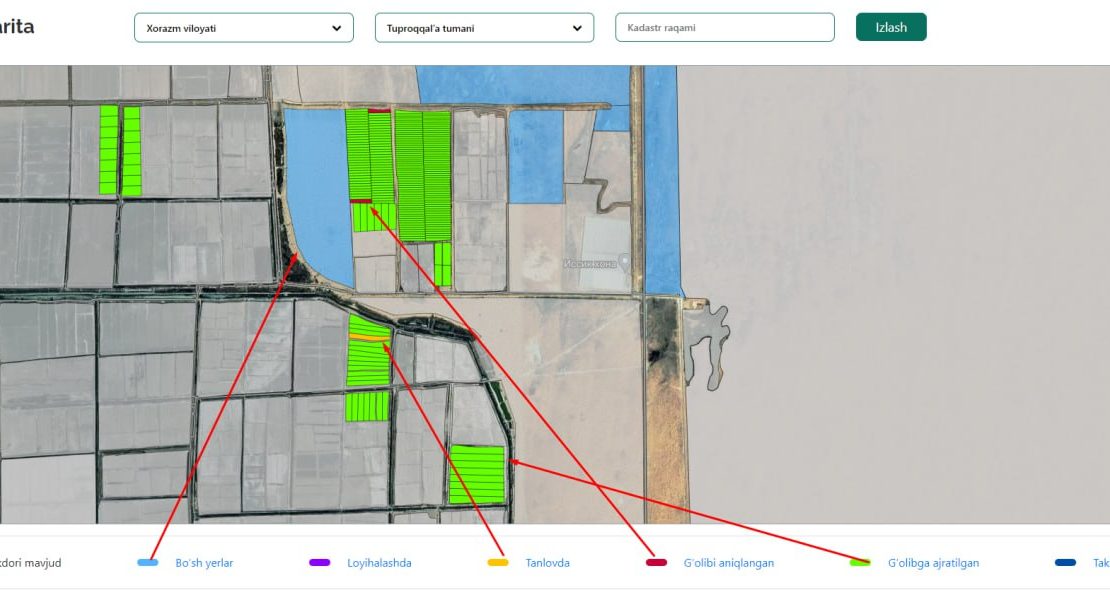 Dehqon xo‘jaligini yuritish uchun yer uchastkalarini ijaraga ochiq elektron tanlovlar orqali olishda qulaylik bo‘lishi uchun “E-IJARA” axborot tizimining ochiq foydalanish uchun mo‘ljallangan qismi ishga tushirilgan. Bunda http://e-ijara.uz/uz/map manzili bo‘yicha o‘tib, sizni qiziqtirgan hududda qancha bo‘sh va zaxiraga olingan yerlar mavjud, ular bo‘yicha nechta lotlar ishlab chiqilgan va qanchasi g‘oliblarga ajratilganligini geografik koordinataga bog‘langan holda vizual qulay ko‘rib, kuzatib turish, shuningdek, sizni qiziqtirgan yer uchastkasi bo‘yicha taklif kiritish imkoniyatlari yaratilgan.