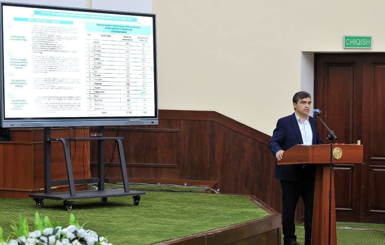 Министр сельского хозяйства Жамшид Ходжаев подробно остановился на задачах по поэтапному возвращению в 2020-2025 гг на резерв 200 тыс. га освобожденных от хлопка и зерна нерентабельных посевных площадей, которыми пользуются фермерские хозяйства и кластеры, а также проведению их кадастровой регистрации в качестве государственного имущества и разделения данных земель на лоты объемом от 0,10 до 1,0 га для выставления на открытые электронные конкурсы.