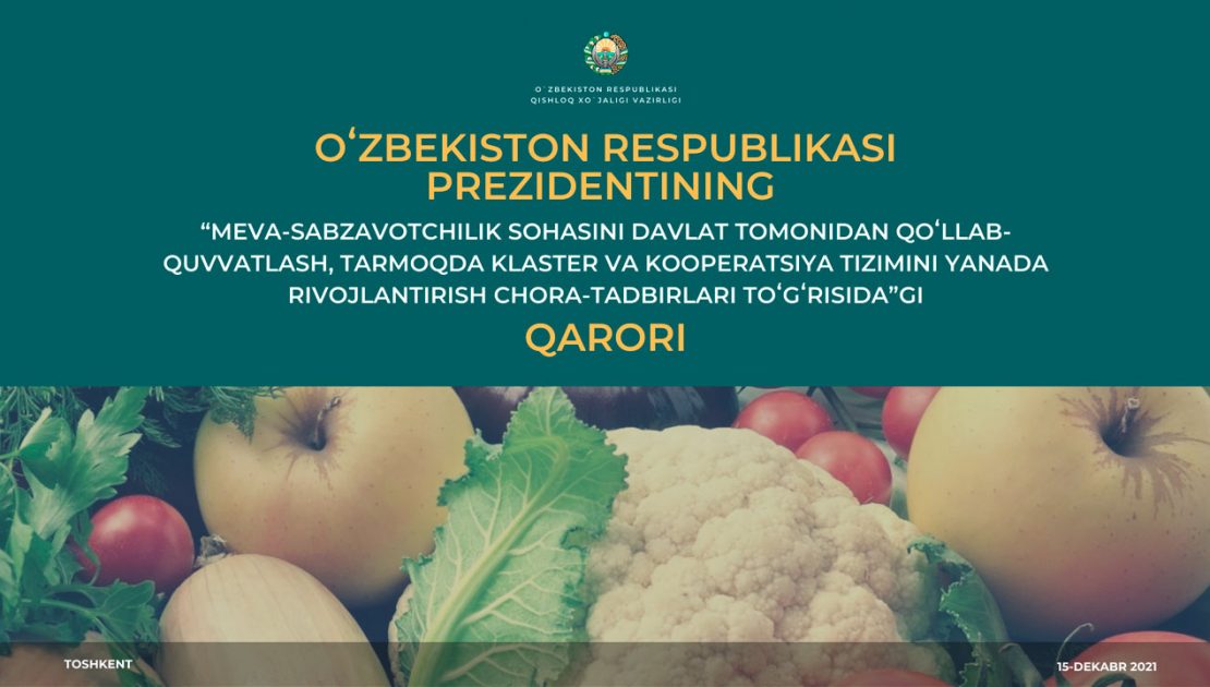 Meva-sabzavotchilik sohasida mahsulot ishlab chiqarish, qayta ishlash, saqlash, xizmat ko‘rsatish va sotish (eksport qilish) jarayonlarini o‘zaro integratsiya qilish, klasterlar (kooperatsiya) faoliyatini rivojlantirish, oziq-ovqat xavfsizligini ta’minlash va eksport hajmini oshirish maqsadida: