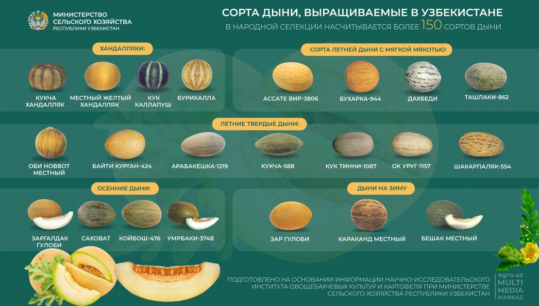 В Узбекистане выращивают сорта, таких видов дынь как хандалляк, летняя дыня с мягкой мякотью, летняя с жесткой мякотью, осенняя и дыни на зиму.