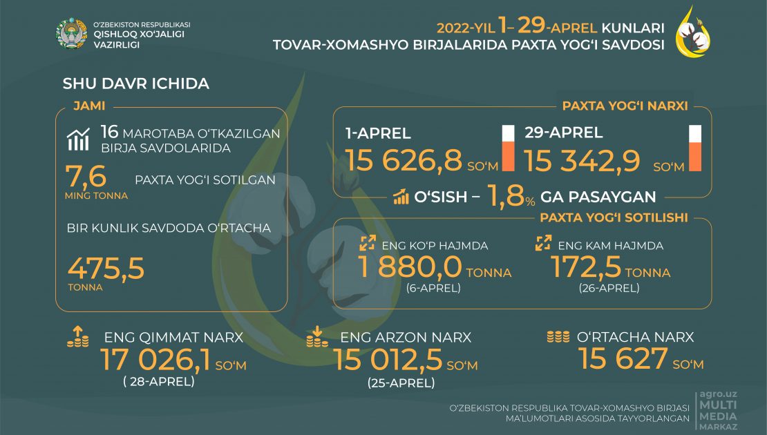 ✅2022-yil aprel oyida Tovar-xomashyo birjalaridagi 16 marotaba o‘tkazilgan savdolarda 7,6 ming tonna paxta yog‘i savdosi amalga oshirilgan.