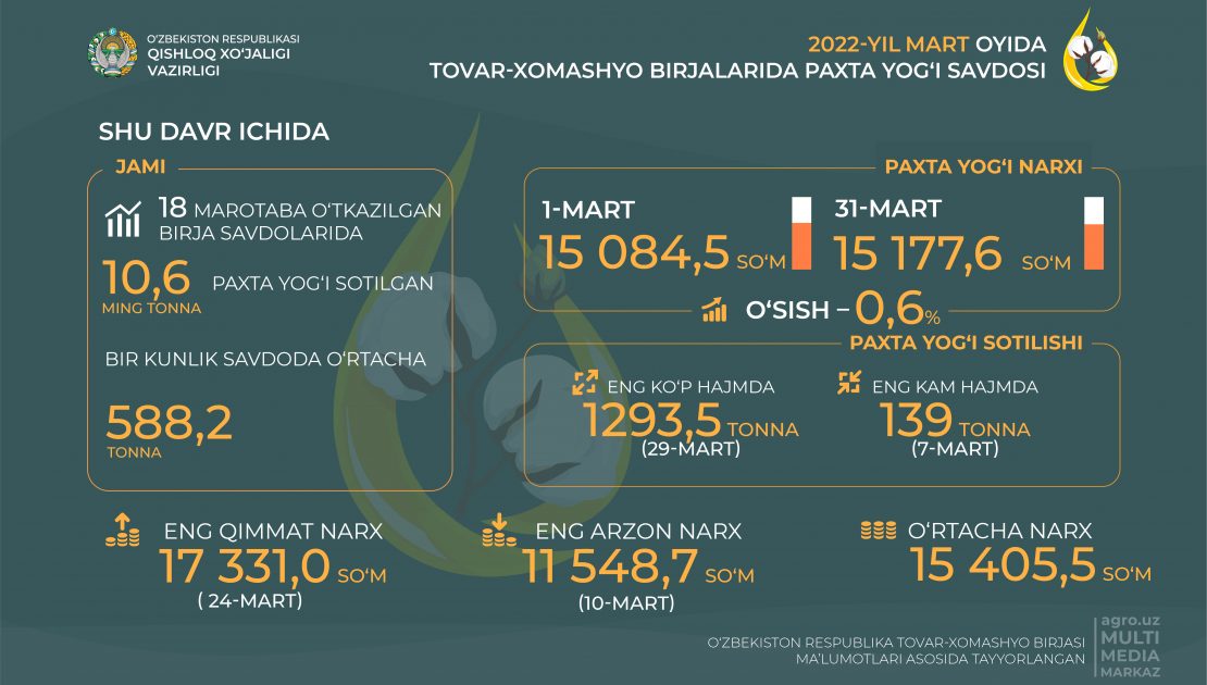 ✅2022-yil mart oyida Tovar-xomashyo birjalaridagi 18 marotaba o‘tkazilgan savdolarda 10,6 ming tonna paxta yog‘i savdosi amalga oshirilgan.