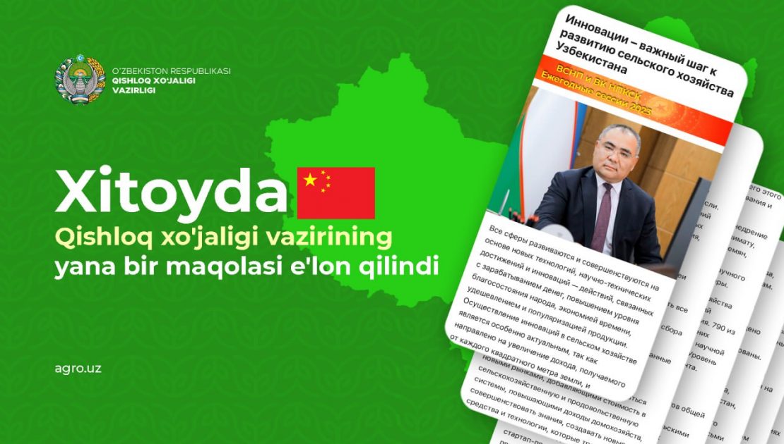 Xitoy davlatining mashhur jurnallaridan biri hisoblangan “Xitoy” jurnalida Qishloq xo‘jaligi vaziri Ibrohim Abdurahmonovning “Innovatsiya — O’zbekiston qishloq xo‘jaligini rivojlantirishda muhim qadam” nomli maqolasi chop etildi.